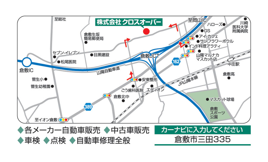 株式会社 クロスオーバー 代表取締役 : 平松 訓生 取締役工場長 : 小坂 満 〒 710-0001 岡山県倉敷市三田335-1 電話 : 086-441-0780 FAX : 086-441-0742 定休日: 日・祝日 営業時間: 9:00 〜19:00
